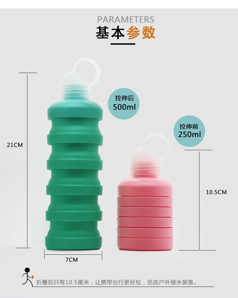 便攜式硅膠折疊水瓶采用食品級硅膠材質(zhì),符合食品級標(biāo)準(zhǔn),符合相關(guān)質(zhì)檢標(biāo)準(zhǔn),這款運(yùn)動折疊水瓶是本公司2021年最新研發(fā)生產(chǎn)的硅膠制品,顏色目前只生產(chǎn)了4種,分別為灰色,綠色,藍(lán)色,粉紅色,瓶蓋為白透明色,也可以根據(jù)要求來定制各種材質(zhì)或者是不同形狀的瓶蓋顏色或者是樣式??裳b熱水,方便旅行攜帶,具有耐摔,耐高溫,柔軟等特點(diǎn)。